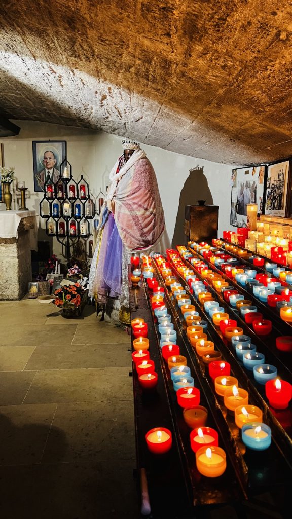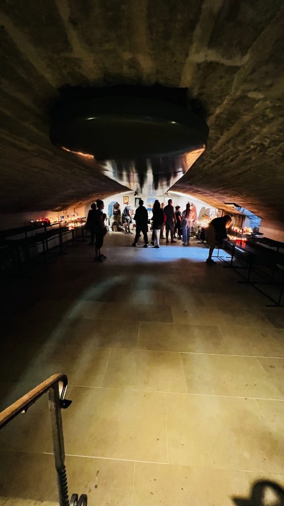 In der Krypta werden Fürbitten und Kerzen offeriert und vor den Gebeinen der Heiligen wird gebetet.