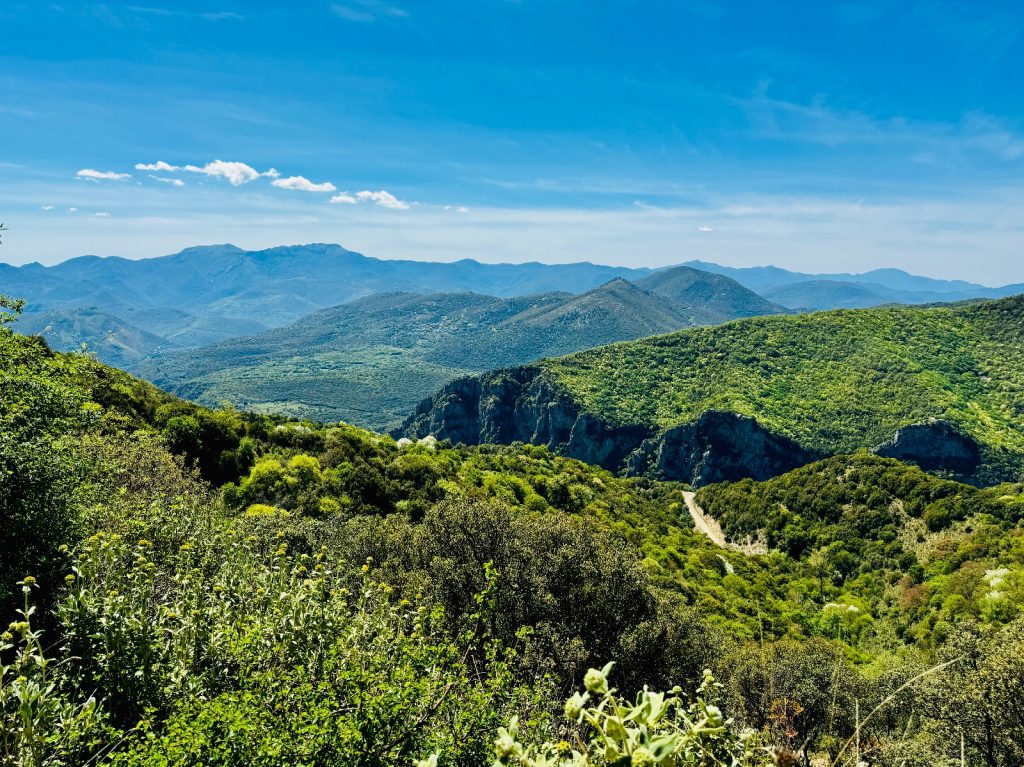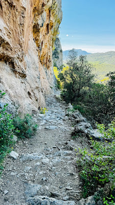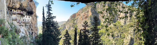 Durch Zypressen, Ahornbäume, Eukalyptus und die magentafarbenen Judasbäume (Cercis Siliquastrum) geht der Weg auf halber Höhe der Louisios-Schlucht entlang, bis plötzlich das Kloster erscheint, überhängend wie ein Schwalbennest in die Felswand gebaut… Unglaublich dass an einem solchen Ort noch heute Mönche leben, und die Besucher bei Kaffee und Gebäck in der Klosterstube empfangen.(Achtung: Besuchszeiten beachten! Kein Zugang von 13 bis 17 Uhr).