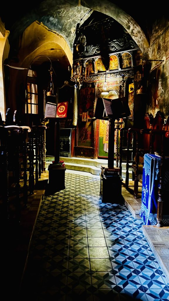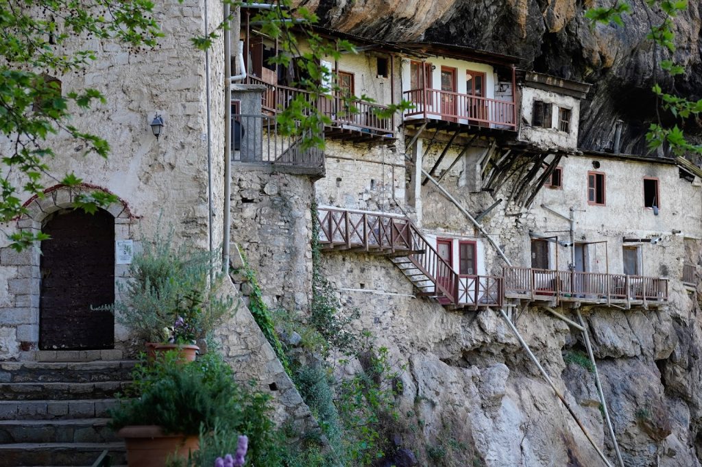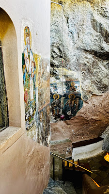 Uralte Fresken auf den nackten Felswänden und eine kleine Kapelle mit etwa 10 Holzsesseln sprechen vom einfachen Leben der Mönche, die dieses Leben in karger Abgeschiedenheit auf sich nehmen.